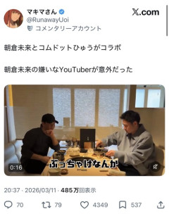 1: 2026/03/14(土) 18:08:11.70 朝倉未来とコムドットひゅうがコラボ朝倉未来の嫌いなYouTuberが意外だった pic.twitter.com/4fryyvqELs— マキマさん (@RunawayUoi) March 11, 2026 未来とぷろたんここからコラボしてないんよな。未来がこの時暗算できない事を弄られてかなり怒ってる。 pic.twitter.com/bCvVp01Z6i— マキマさん (@RunawayUoi) March 12, 2026 不良上がりって基本的に学力いじりや学歴いじり異常に嫌うからやめた方がいい。地味に彼らそこらへんコンプめっちゃある。あっけらかんとしてるように見えてめっちゃコンプ強い。いじるなら相手がコンプ感じてない部分をちゃんと見抜いてそこを的確に突けないと地雷踏むからあかん。 — 私論理 (@lonricality) March 13, 2026 ※関連記事 【悲報】朝倉未来、相手が強すぎてコーナー端に避難することすら許されないwwww…