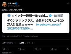 松本人志さん、久しぶりにツイート「めちゃくちゃウソです!」 ツイッター速報の「ダウンタウンプラス、会員が50万人から20万人に激減wwww」に