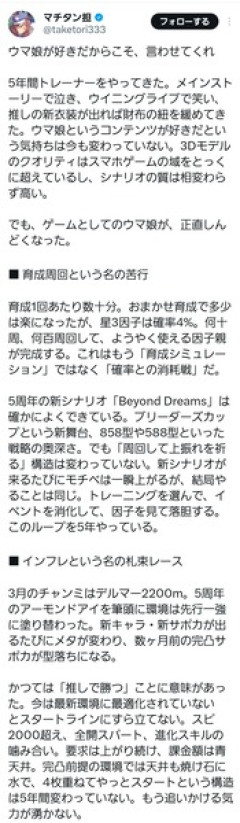 【悲報】「ウマ娘」歴5年のガチ勢、長文でお気持ち表明wwww