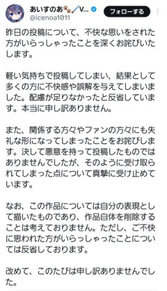 1: 2026/03/16(月) 17:48:19.424 VTuber界の大谷翔平を紹介した絵師Vtuber知らない方へ#どろういんぐ pic.twitter.com/p6FEE2krkh— あいすのあ🐾🖌️Vtuber兼絵描き (@icenoa1011) March 15, 2026 昨日の投稿について、不快な思いをされた方がいらっしゃったことを深くお詫びいたします。軽い気持ちで投稿してしまい、結果として多くの方に不快感や誤解を与えてしまいました。配慮が足りなかったと反省しています。本当に申し訳ありません。… — あいすのあ🐾🖌️Vtuber兼絵描き (@icenoa1011) March 16, 2026 ※関連記事 【画像】この漫画の「ダメ人間」と付き合っている彼女の話、少し怖くて草wwwww…