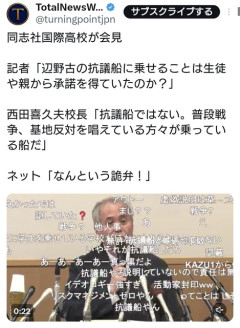 1: ホスアンプレナビルカルシウム(東京都) [JP] 2026/03/17(火) 13:14:26.13 ID:siQoydOQ0● BE:662593167-2BP(2000) 本記事はネット上の反応を整理したものであり、特定の立場を支持するものではありません。 引用元: ・ スポンサーリンク スポンサーリンク 64: ビダラビン(ジパング) [ニダ] 2026/03/17(火) 13:25:56.35 ID:SxGzxTT50 >>1 285: ペラミビル(やわらか銀行) [ニダ] 2026/03/17(火) 14:31:38.23 ID:MfT5DuNc0 >>64 本まで出してるのかよww 103: インターフェロンβ(やわらか銀行) [ニダ] 2026/03/17(火) 13:32:41.35 ID:W4uuxJsK0 >>1 抗議船「平和丸」に乗った日本共産党の赤嶺政賢衆院議員は 「私たちのたたかいは世界の平和の流れを大きく後押しする」とカヌー隊を激励しました。 赤旗には平和丸=抗議船と書いてあるがデマ記事なの? 217: ソホスブビル(埼玉県) [US] 2026/03/17(火) 14:05:12.75 ID:0OVuDv440 >>103 その時はその時なんだろ多分 212: オムビタスビル(庭) [ニダ] 2026/03/17(火) 14:03:22.86 ID:VWgTeN1Z0 >>1 船を運航するヘリ基地反対協議会とも利用に関しての契約書も交わしてないと発言 249: アシクロビル(福島県) [US] 2026/03/17(火) 14:14:03.79 ID:T8xta15p0 >>1 それを一般的には抗議船と呼ぶ 286: ダサブビル(茸) [US] 2026/03/17(火) 14:31:57.28 ID:HL/PP0Nn0 >>249 それなのよね 3: プロストラチン(庭) [ニダ] 2026/03/17(火) 13:15:18.79 ID:Taa76wxd0 何言ってんだこのひと 5: オムビタスビル(沖縄県) [GB] 2026/03/17(火) 13:15:38.43 ID:ajDXVmhO0 すごいなあ 8: ラニナミビルオクタン酸エステル(ジパング) [ニダ] 2026/03/17(火) 13:16:06.85 ID:i6GQhnsD0 学校が組織的に反政府組織に学童を送り込み、対価を支払っていた。 会見ではっきりしたな。 9: テノホビル(岡山県) [ニダ] 2026/03/17(火) 13:16:13.82 ID:d3J9zmDG0 だから抗議船なのでは? 12: バロキサビルマルボキシル(新潟県) [KR] 2026/03/17(火) 13:16:41.54 ID:D2wyknlT0 これ半分完全に抗議船だろ 14: ホスフェニトインナトリウム(ジパング) [CN] 2026/03/17(火) 13:16:54.87 ID:wz9o2xES0 それを抗議と言うんじゃないのか 20: ラミブジン(ジパング) [ニダ] 2026/03/17(火) 13:18:29.43 ID:KCD/aNz80 「海保の船に追突されて大破したけど修理しました!」 pbs.twimg.com/media/CED84r-VIAA0jEw.jpg 抗議どころか海保への体当たり芸もやる「抗議船」 大々的に取り上げてくれたお仲間の新聞が はっきり「抗議船」って書いてるやん 262: エルビテグラビル(東京都) [ニダ] 2026/03/17(火) 14:19:19.15 ID:xlk61c/B0 >>20 ほほう 279: ペラミビル(やわらか銀行) [ニダ] 2026/03/17(火) 14:30:28.96 ID:MfT5DuNc0 >>20 抗議船と自称して募金まで集めてたぞ 21: ペラミビル(福岡県) [US] 2026/03/17(火) 13:18:32.44 ID:vokyM7sR0 校長もそっちか 23: ラルテグラビルカリウム(茸) [ニダ] 2026/03/17(火) 13:18:46.24 ID:cgMu1evF0 人サツしが何を言うのか、怒りしかない 26: オセルタミビルリン(庭) [ニダ] 2026/03/17(火) 13:18:51.13 ID:4g4Y52Wi0 そういう学校なんだねここって 27: インターフェロンβ(やわらか銀行) [ニダ] 2026/03/17(火) 13:18:53.35 ID:W4uuxJsK0 「救急車が救急車と誤解された」とかいう共産党構文の応用 29: ビダラビン(奈良県) [US] 2026/03/17(火) 13:19:11.01 ID:gD3uyMeT0 TBSのニュース 「同志社の辺野古の見学は2015年から。はじめは辺野古の浜からだったが 船長が牧師だった縁で2023年から乗船して海から見学するようになった」 s://www.youtube.com/watch?v=qqI8lmIIQqw 予想した通り宗教つながり 39: バルガンシクロビル(ジパング) [ニダ] 2026/03/17(火) 13:20:10.37 ID:eRb+OCS60 やばいな同志社 66: ビダラビン(奈良県) [US] 2026/03/17(火) 13:26:03.66 ID:gD3uyMeT0 >>39 プロテスタントの反戦平和運動と日韓左翼の自虐史観が 底のところでつながってるのよ デジャブかってくらい何度も見てきた 75: エトラビリン(ジパング) [US] 2026/03/17(火) 13:27:04.90 ID:ispElarT0 >>66 キリストの許しと一切繋がらない謎 41: ダサブビル(京都府) [CN] 2026/03/17(火) 13:20:27.17 ID:WliaMf2w0 学校が活動家の集団だったんだな スッキリしたわ 42: ビダラビン(奈良県) [US] 2026/03/17(火) 13:20:36.44 ID:gD3uyMeT0 そもそも観光地でもあるまいし、辺野古基地を海から見学できるのって 活動家の船に乗る以外無理だと思うが わざわざ高校生に見せる意味もわからん 49: ◆65537PNPSA (SB-Android) [DE] 2026/03/17(火) 13:22:12.99 ID:+6Kci14Z0 >>42 そもそも海から見学する必要ある? 134: リトナビル(ジパング) [US] 2026/03/17(火) 13:37:49.31 ID:RwbBRqTM0 >>42 子供を乗せてると海保の対応が甘くなる 137: ポドフィロトキシン(東京都) [US] 2026/03/17(火) 13:39:03.01 ID:/S7aPnbE0 >>134 ドクズじゃん 141: ダサブビル(茸) [ニダ] 2026/03/17(火) 13:40:40.28 ID:4Rn2Uegb0 >>134 奴ら子供を盾にするの大好きだよね 45: ◆65537PNPSA (SB-Android) [DE] 2026/03/17(火) 13:21:09.92 ID:+6Kci14Z0 右翼の街宣車に乗せたって考えたら問題の重要性が分かるだろ? 52: ダサブビル(京都府) [CN] 2026/03/17(火) 13:23:34.27 ID:WliaMf2w0 >>45 右翼の街宣車に乗せて注意報が出てる危険な日に金払って乗せてたって話だな 51: ネビラピン(岐阜県) [DE] 2026/03/17(火) 13:23:30.75 ID:nvkyi7Jp0 知らなかったんじゃないの?えらく詳しいね 53: ラニナミビルオクタン酸エステル(ジパング) [ニダ] 2026/03/17(火) 13:23:40.21 ID:i6GQhnsD0 ニヤニヤしする場面じゃないだろ。 何だこの校長