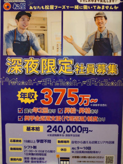 松屋の深夜限定社員さん、年収375万円の超高給取りだったwwww