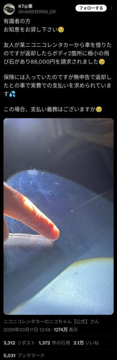 【悲報】ニコニコレンタカーさん、1ミリくらいの傷があると騒ぎ5万円以上の修理費を請求する事案を連発wwwwww