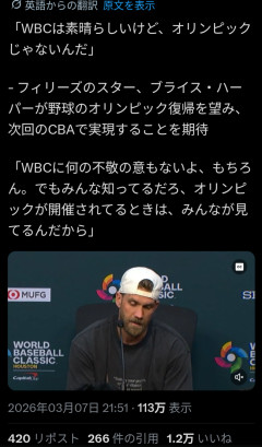 1: それでも動く名無し 2026/03/18(水) 12:01:58.350 ハーパー「WBC、ねぇw……オリンピックの下位互換でしょw」 スクーバル「WBCってただのエンジョイお祭り大会でしょw何マジになってんだよwそれじゃあ俺帰るわw」 2: それでも動く名無し 2026/03/18(水) 12:02:04.283 うおw 3: それでも動く名無し 2026/03/18(水) 12:02:24.152 こんなオールスターレベルの大会に何マジになっちゃってんのw…
