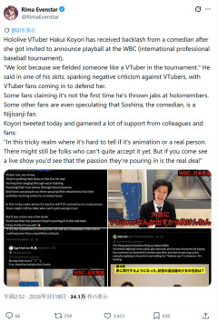 1: 2026/03/18(水) 12:03:52.330 Hololive VTuber Hakui Koyori has received backlash from a comedian after she got invited to announce playball at the WBC (international professional baseball tournament). "We lost because we fielded someone like a VTuber in the tournament." He said in one of his skits, sparking… pic.twitter.com/XGqiFvrGi1— Rima Evenstar (@RimaEvenstar) March 17, 2026 ※関連記事 【悲報】粗品さん、バチャ豚にとんでもないことをされてブチギレ…