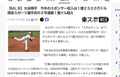 1 : 【MLB】大谷翔平 今年のスポンサー収入は1億2500万ドル 現役スポーツ選手初の2年連続1億ドル超え(東スポWEB) - Yahoo!ニュース 米スポーツビジネス専門サイト「スポルティコ」は17日(日本時間18日)にドジャースの大谷翔平投手(31)がスポンサー収入などで1億2500万ドル(約199億円)を手にすると発表した。 「MLBの2026年最高年俸選手:大谷がスポンサー経由で1億2500万ドル獲得」の見出しで報じた。全文はソースで…