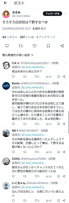 1: 匿名 2026/02/15(日) 15:54:07 比例当選者176人に証書付与 衆院選、自民党が最多67人 比例当選者176人に証書付与 衆院選、自民党が最多67人:北海道新聞デジタル中央選挙管理会(中央選管)は14日、第51回衆院選比例代表の当選者に当選証書を付与した。比例代表は全国11ブロックで新人64人、前職77人、元職35人の計176人が当選した。うち女性は40人だった。...北海道新聞デジタル…