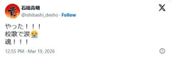 転載元: 征夷大将軍 ★ 2026/03/19(木) 14:58:14.06 ID:cRroq+UX9 オリコン2026-03-19 12:58 お笑いコンビ・とんねるずの石橋貴明が19日、自身のXを更新。およそ2ヶ月ぶりの更新で、母校・帝京高校を祝福した。 センバツで、帝京高校が沖縄尚学に勝利を収め「やった!!!校歌で涙。魂!!!」とつづった。 石橋は、2025年4月、自身のYouTubeチャンネルで食道がんを公表。そのご、咽頭がんも併発していることを明かし、当面の芸能活動休止を発表していた。10月12日には、約9ヶ月ぶりにSNSを更新した。12月には、元プロ野球選手でタレントの杉谷拳士が、石橋との2ショットを公開し、話題を呼んでいた。 ※やった!!!校歌で涙😭魂!!!— 石橋貴明 (@ishibashi_desho) March 19, 2026 3: 名無しさん@恐縮です 2026/03/19(木) 15:00:38.04 ID:bI4rKjBz0 ご存命で何より…