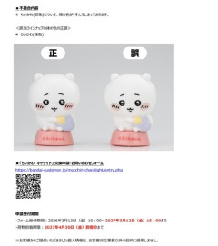 1: 2026/03/19(木) 19:52:58.74 「もっちりころりん♪ ちいかわ」「 ちいかわ キャライト」ご購入のお客様へお詫びとお知らせ 商品をお買い求めいただきましたお客様にお詫びとお知らせがございます。 以下のサイトよりそれぞれの商品のお知らせをご確認いただきますよう、お願いいたします。 もっちりころりん♪ ちいかわ ちいかわ キャライト 色の不具合の説明 バンダイ食玩のちいかわ「キャライト」と「もっちりころりん」の色の不具合で交換を受け付けているようです。気になる方は下のURLをチェックしてください。 pic.twitter.com/ac1KUO1Mxp— てぃとす🪼@ちいかわインフォメーション (@chiichiiusa) March 19, 2026 ※関連記事 【衝撃】ちいかわ作者、去年の「年収2000万円」超えwwwww…