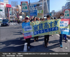 1: ななしさん@発達中 26/03/19(木) 12:58:37 ID:iNAK 高騰する首都圏の住居費への対策を求める「家賃高すぎ。何とかしろ!」デモが東京都新宿区内で行われ、約200人の市民が、国や都に公営住宅の増設や家賃補助の実施などをアピールした。都内23区の新築マンション価格が1億円を大きく超え、賃貸物件の値上げが進む中、「住まいは人権」と居住権を前面に出したデモは珍しい。…