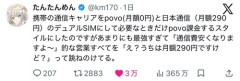 1: 2026/03/20(金) 00:23:52.379 携帯の通信キャリアをpovo(月額0円)と日本通信(月額290円)のデュアルSIMにして必要なときだけpovo課金するスタイルにしたのですがあまりにも最強すぎて「通信費安くなりますよ~」的な営業すべてを「え?うちは月額290円ですけど?」って跳ねのけてる。— たんたんめん (@km170) March 18, 2026 ※関連記事 【画像】この漫画の「ダメ人間」と付き合っている彼女の話、少し怖くて草wwwww…