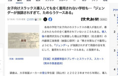 1 : 各地の学校で女子向けのスラックスの導入が進むが、導入されたものの全く着用されていないところもある。導入後の着用状況などを調査した椙山女学園大(名古屋市)の内藤章江准教授(被服心理学)は「寒さ対策などで着用しようにも、『ジェンダー』が強調されすぎて周囲の目を気にして、着用をためらうケースもある」と指摘する。 調査は、大手制服メーカーの菅公学生服(岡山市)と2023年までの5年間に、導入したり、導入を検討したりした全国の中学校に実施した。導入した357校のうち、277校が「着用率10%程度」とし、「全く着用されていない」も11校あった。全文はソースで…