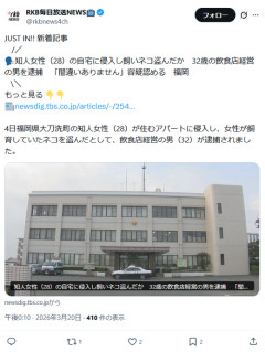 1 名前:牛乳トースト ★:2026/03/20(金) 12:22:30.23 ID:wbNyLNOw9.net 4日福岡県大刀洗町の知人女性(28)が住むアパートに侵入し、女性が飼育していたネコを盗んだとして、飲食店経営の男(32)が逮捕されました。 住居侵入と窃盗の疑いで逮捕されたのは、福岡県久留米市西町に住む、飲食店経営の工藤優容疑者(32)です。 工藤容疑者は4日午前8時50分ごろから午後1時40分ごろまでの間、大刀洗町にある知人女性(28)の自宅のアパートに侵入し、女性が飼っていたネコ1匹を盗んだ疑いがもたれています。 引用元…