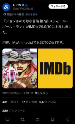 【速報】ジョジョ7部、海外レビューで歴代最高評価を叩き出し史上最高のTV番組となるwwwwwwwww