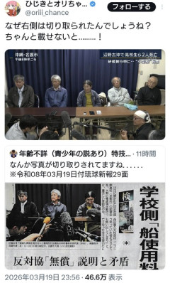 1 名前:名無しさん@涙目です。[sage] 投稿日:2026/03/20(金) 09:03:42.72 ID:GfINZmCW0 3 名前:名無しさん@涙目です。[] 投稿日:2026/03/20(金) 09:06:31.40 ID:4Ws7ELCd0 左に寄ってるだけ 33 名前:名無しさん@涙目です。[] 投稿日:2026/03/20(金) 09:19:10.88 ID:LPjHEIAu0 >>3 たしかにw 186 名前:名無しさん@涙目です。[] 投稿日:2026/03/20(金) 12:02:41.81 ID:Iph9v4JT0 >>3 船の沈没原因が「左に傾いてたから」に匹敵する良レス 195 名前:名無しさん@涙目です。[] 投稿日:2026/03/20(金) 12:36:12.12 ID:XrpM+8Wz0 史上最高のふてくされ顔 (´・ω・`) 188 名前:名無しさん@涙目です。[sage] 投稿日:2026/03/20(金) 12:17:37.41 ID:JDutuEWW0 左3人はけっこう悲痛な顔してるけど右はぶぜんとも見えるな 22 名前:名無しさん@涙目です。[sage] 投稿日:2026/03/20(金) 09:14:53.98 ID:FMGwxdOe0 謝罪会見ワースト1位を塗り替えたと話題の謝罪会見 KAZU Ⅰの謝罪会見ですら社長はスーツ着てたし頭下げたし腕組なんてしてなかったのに 60 名前:名無しさん@涙目です。[] 投稿日:2026/03/20(金) 09:41:37.33 ID:tRN9gj+00 >>22 とにかく見た目が小汚いパヨク連中だったな 126 名前:名無しさん@涙目です。[sage] 投稿日:2026/03/20(金) 10:31:02.98 ID:m1Dkf/2E0 >>22 背筋をピンと伸ばして絶対に謝んねえぞという強い意志を示してる素晴らしい写真 13 名前:名無しさん@涙目です。[sage] 投稿日:2026/03/20(金) 09:11:40.42 ID:LQraOj0O0 右二人は人相が悪い以外にそんな隠したい奴らなのか 16 名前:名無しさん@涙目です。[sage] 投稿日:2026/03/20(金) 09:12:58.71 ID:kr7z+03V0 実際、この二人って誰なの? 20 名前:名無しさん@涙目です。[sage] 投稿日:2026/03/20(金) 09:14:26.25 ID:nT4HVbWU0 >>16 一番右は平和丸の船長で事故の超重要人物 右から2番目は中核派とも関係がある活動家 29 名前:名無しさん@涙目です。[sage] 投稿日:2026/03/20(金) 09:18:05.90 ID:ERTfKC6w0 >>20 活動家なのは全員だぞ 23 名前:名無しさん@涙目です。[sage] 投稿日:2026/03/20(金) 09:15:08.89 ID:kr7z+03V0 >>20 なるほど、隠したいのは中核派か 86 名前:名無しさん@涙目です。[] 投稿日:2026/03/20(金) 09:56:15.70 ID:kyUf97kP0 >>23 沖縄の選挙での応援で、小沢一郎や志位と一緒に壇上に上がってたりするしな 27 名前:名無しさん@涙目です。[] 投稿日:2026/03/20(金) 09:16:06.28 ID:JrlgvT/t0 >>20 なんで船長が中央じゃないんですかね? 28 名前:名無しさん@涙目です。[] 投稿日:2026/03/20(金) 09:16:11.25 ID:BBzID2dB0 >>20 あかんやん犯人かくしたんか 119 名前:名無しさん@涙目です。[] 投稿日:2026/03/20(金) 10:24:16.40 ID:8VYTj+G40 >>20 これたまに見るけどソースどこなの 180 名前:名無しさん@涙目です。[] 投稿日:2026/03/20(金) 11:40:27.03 ID:JLSo2KOQ0 >>119 そいつは仲本興真で、4名いたと言われる船長の内の1人 事件当日、操船してたと言う明確な情報は無いね 日頃、工事を妨害して海保を挑発してるクズってのは間違いない 30 名前:名無しさん@涙目です。[sage] 投稿日:2026/03/20(金) 09:18:31.56 ID:fLzPBfW20 もうこの腕組み爺も特定されたの? 32 名前:名無しさん@涙目です。[sage] 投稿日:2026/03/20(金) 09:19:06.56 ID:jseiM8p60 >>30 とっくの昔に 辺野古活動家の謝罪会見でまともにお辞儀せずに腕を組んでた人、こんな所で見つかる 19 名前:名無しさん@涙目です。[sage] 投稿日:2026/03/20(金) 09:14:09.65 ID:jseiM8p60 まさにこの絵そのものだな 87 名前:名無しさん@涙目です。[] 投稿日:2026/03/20(金) 09:56:42.66 ID:dcnvfJ4z0 >>19 なるほど 210 名前:名無しさん@涙目です。[] 投稿日:2026/03/20(金) 14:07:06.88 ID:sN5Tem1L0 >>19 すでに全体像が広まりきってから切り取ってるからちょっと違うな 219 名前:名無しさん@涙目です。[] 投稿日:2026/03/20(金) 14:37:51.15 ID:kc7hnyYJ0 >>210 おれたちがネットで知ってる全体像と、マスゴミの中の全体像は違うぞ 130 名前:名無しさん@涙目です。[sage] 投稿日:2026/03/20(金) 10:36:42.48 ID:FcQUAdQI0 こっちは産経の該当記事の途中だけどこれ見て「産経が隠してる!」って思うか? 131 名前:名無しさん@涙目です。[] 投稿日:2026/03/20(金) 10:41:14.91 ID:KlKoVFFg0 >>130 共同代表2名のキリトリだけど? バカなの? 134 名前:名無しさん@涙目です。[sage] 投稿日:2026/03/20(金) 10:42:38.87 ID:PzqkxMmc0 >>130 その記事の上部に全員乗った画像あるだろ 隠してるのはお前や 150 名前:名無しさん@涙目です。[sage] 投稿日:2026/03/20(金) 10:54:29.39 ID:FcQUAdQI0 >>134 琉球新報の記事にも全員が載った写真あるが 159 名前:名無しさん@涙目です。[sage] 投稿日:2026/03/20(金) 11:01:27.37 ID:PzqkxMmc0 >>150 >>1のは新聞でお前のサイトじゃん 産経は同じサイト内だよ 147 名前:名無しさん@涙目です。[sage] 投稿日:2026/03/20(金) 10:53:35.88 ID:krqBYEEr0 >>130 やっぱパヨカスのおまエラって境界知能なんだな。 138 名前:名無しさん@涙目です。[] 投稿日:2026/03/20(金) 10:44:25.90 ID:jlCxAUPn0 琉球新報のオンライン記事の写真だけど、前代表(創立者)の態度の悪さを隠そうと徹底してるね 前代表が唯一頭を下げた一部のシーンを切り抜き 前代表が腕組みしてふんぞり返っていたシーンは前代表をカット 124 名前:名無しさん@涙目です。[] 投稿日:2026/03/20(金) 10:28:59.37 ID:tPPk4TGD0 >>1 この会見で腕組んでるってマスコミが一番叩かなくちゃいけない仕草だろ、人死ん