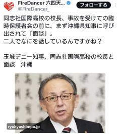 1:2026/03/21(土) 13:55:38.34 ID:FTdaUaJu0同志社国際高校の校長、事故を受けての臨時保護者会の前に、まず沖縄県知事に呼び出されて「面談」。二人でなにを話しているんですかね?玉城デニー知事、同志社国際高校の校長と面談 沖縄 — FireDancer 六四天安門 (@FireDancer_) March 21, 2026転載元スレッド:…