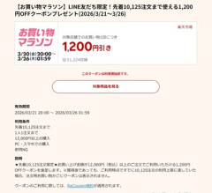 楽天お買い物マラソン、1.2万円以上で使える1200円オフクーポン21日20時から利用可能