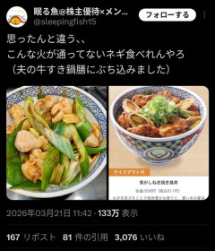 1: 2026/03/21(土) 23:23:45.60 思ったんと違う、、こんな火が通ってないネギ食べれんやろ(夫の牛すき鍋膳にぶち込みました) pic.twitter.com/akppwtrm2X— 眠る魚@株主優待×メンタル疾患 (@sleepingfish15) March 21, 2026 ※関連記事 【画像】この漫画の「ダメ人間」と付き合っている彼女の話、少し怖くて草wwwww…