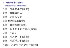 1:それでも動く名無し 2026/03/21(土) 13:09:00.56 ID:NWE23Fy+0 1位 ベルセルク(未完) 2位 進撃の巨人 3位 デビルマン 4位 胎界主(連載中) 5位 堕天作戦(未完) 6位 メイドインアビス(未完) 7位 イムリ 8位 バスタード(未完) 9位 バガボンド(未完) 10位 ハンターハンター(未完) ベルセルク 1 (ヤングアニマルコミックス)三浦建太郎白泉社2013-06-10…