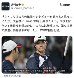1: 2026/03/22(日) 09:46:10.68 ID:ceQ9kkxf0 「ネトフリは大谷の単独インタビューを撮れると思っていたが、大谷サイドからNGを出されたそう。大枚をはたいて放映権を得たのに、大谷には無視され、準々決勝で敗退と誤算続きになった」…