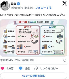 【悲報】NHKさん、ネトフリWBCの成功で「強制ゴミサブスク扱い」され始めてしまう