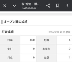 1: それでも動く名無し 2026/03/22(日) 16:38:12.387 ID:V8VvuLlPY あかん 3: それでも動く名無し 2026/03/22(日) 16:40:40.408 ID:CcqafY/kd ハマスタで雑魚相手なら打ち出すよ 4: それでも動く名無し 2026/03/22(日) 16:41:38.676 ID:VGyB6Xg2K wbc戦士はみんな燃え付けてるぞ 5: それでも動く名無し 2026/03/22(日) 16:42:57.483 ID:rfjyTfv8V 守備の人だから…