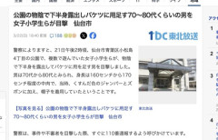 1 : 警察によりますと、21日午後2時頃、仙台市青葉区小松島4丁目の公園で、複数で遊んでいた女子小学生らが、物陰で下半身を露出してバケツに用を足す男を目撃しました。 男は70代から80代とみられ、身長は160センチから170センチ程度の中肉で、当時、くすんだ色のジャンパーとズボンに加え、帽子を着用していたということです。…