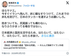 1 : 早稲田大学名誉教授で社会学者の有馬哲夫氏が2026年3月21日にXを更新。高市早苗首相を侮辱しているとも取れる内容のポストを投稿し、波紋が広がっている。 発端となったのは、21日に共同通信が独自で報じた、ホルムズ海峡について、イランが日本の船舶の通過を認める用意があると明らかにしたと報じたこと。 有馬氏はこのポストを引用し、「ほらサナエ。今すぐイランへ飛んで、床に額なすりつけて、これまでの非礼を詫びて、日本のタンカーを通すようお願いしろ」とポストした。 さらに有馬氏は、「抱きついても、尻尾振っても構わない。なりふりかまってる場合ではない」とつづり、「日本経済と国民生活守るため、はたらいて、はたらいて、はたらいて、はたらき抜け。国のため国民のため」とコメントしていた。 このポストには、「根底には男尊女卑、女性蔑視が透けて見える」「コレが学者の書く事か?」「下品、ただそれだけしかないポスト」という声が集まっている。…