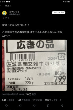 【悲報】スーパーの牛肉、滅茶苦茶な値段の付け方で炎上。サービス料ってやつか?wwww