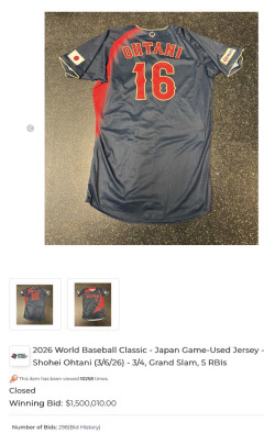引用元: それでも動く名無し 2026/03/23(月) 23:40:52.50 ID:RQ8YuCI10 WBCで大谷が着用したユニフォーム 150万10ドル(日本円 2億3900万円)で落札 ※本人サインなし 2: それでも動く名無し 2026/03/23(月) 23:41:16.14 ID:RQ8YuCI10 前回WBCユニフォームは12万6110ドル(1700万円) 3年で大谷の価値爆上がり…