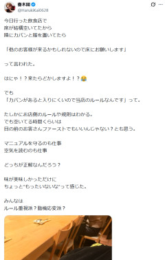 1. 匿名@ガールズちゃんねる 「今日行った飲食店で席が結構空いてたから 隣にカバンと服を置いてたら『他のお客様が来るかもしれないので床にお願いします』って言われた」 「はにゃ!? 来たらどかしますよ!? でも『カバンがあると入りにくいので当店のルールなんです』って。たしかにお店側のルールや規則はわかる。でも空いてる時間くらいは目の前のお客さんファーストでもいいんじゃない?とも思う。マニュアルを守るのも仕事 空気を読むのも仕事 どっちが正解なんだろう?」 ↓ 大きな反響 「働いてる立場になって、アンタはどう?」 「だったらせめて籠くらい用意しておいて欲しいもの」 「椅子は荷物を置くとこじゃない店員もそれを求めるならカゴ用意しとけよ」 「いや、人としてのマナーじゃね?」 など 2026/03/24(火) 12:42:32…