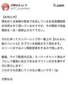 1: 2026/03/24(火) 17:53:56.10 収益受け取り停止した状態を法的に収入0円って認めてええんか? YouTubeの使用上、受け取らなかった収益はアカウントにストックされ続けて、受け取り再開した時にまとめて入ってくるんやが 【お知らせ】現在ぼくは皆様の税金で生活している生活保護制度を利用させて頂いているのですが、その関係で収益関係を一旦一部停止させて下さい。それに伴ってメンバーシップの一番上の【わんわん組スペシャル】のプランを削除させて頂きます。エリートまではメン限配信等をするので残します。… pic.twitter.com/BPimJeaivX— 犬野はる🐶 (@VT_InunoHaru) March 23, 2026 ※関連記事 【画像】この漫画の「ダメ人間」と付き合っている彼女の話、少し怖くて草wwwww…