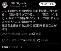 1: 2026/03/25(水) 09:10:14.420 この前超かぐや姫の発声可能上映観に行ったら、「三分間待ってやる…!」「黒閃!ドオオオン」とかガチで関係ないことばっか叫びまくる人が何人もいて最悪だった記憶を上書きするために3回目を観ることが確定— ピネピネ_math (@pinepine_math) March 24, 2026 ※関連記事 【画像】この漫画の「ダメ人間」と付き合っている彼女の話、少し怖くて草wwwww…