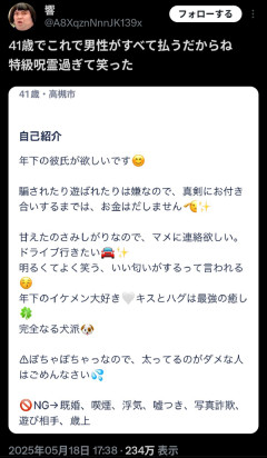 【画像】41歳女性「年下の彼氏欲しい!遊ばれたら嫌なので真剣にお付き合いするまで金払わん😤」