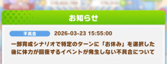 0: 名無しのトレーナー 26/03/24(火)13:52:07 No.1413790716 これ私の事だ…! 1: 名無しのトレーナー 26/03/24(火)13:52:41 No.1413790840 体力の最大値か減っている 2: 名無しのトレーナー 26/03/24(火)13:53:09 No.1413790930 それは仕様です 3: 名無しのトレーナー 26/03/24(火)13:56:22 No.1413791519 他所でも不具合に怒るよりなんか悲しい反応が多い! 4: 名無しのトレーナー 26/03/24(火)13:58:19 No.1413791904 片頭痛とか夜更かし気味とかも併発するぞ! 5: 名無しのトレーナー 26/03/24(火)13:59:30 No.1413792097 現実も修正しろ詫び石も配れ 6: 名無しのトレーナー 26/03/24(火)14:00:38 No.1413792333 この不具合全然治らないんだけど 7: 名無しのトレーナー 26/03/24(火)14:02:00 No.1413792578 怠け癖夜ふかし気味肌荒れ偏頭痛 8: 名無しのトレーナー 26/03/24(火)14:07:35 No.1413793748 >現実も修正しろ>詫び石も配れわかりました 9: 名無しのトレーナー 26/03/24(火)14:20:39 No.1413796386 やる気上げた直後にやる気下がるバグがいつまでも直らないんですけど! 10: 名無しのトレーナー 26/03/24(火)14:23:44 No.1413796959 おじさんになるとね休息はバッチリを引いたのにゲージが30しか回復しなくなるんだ… 11: 名無しのトレーナー 26/03/24(火)14:24:35 No.1413797126 そのうち他のコマンド選べなくなるから安心して欲しい 12: 名無しのトレーナー 26/03/24(火)14:24:41 No.1413797149 >やる気上げた直後にやる気下がるバグがいつまでも直らないんですけど!上げようとしても上がらない 13: 名無しのトレーナー 26/03/24(火)14:25:23 No.1413797295 >詫び石も配れ膀胱ボックスに配布しました 14: 名無しのトレーナー 26/03/24(火)14:27:19 No.1413797677 >>詫び石も配れ>膀胱ボックスに配布しました痛みで泣いて詫びたくなる石じゃねえか 15: 名無しのトレーナー 26/03/24(火)14:29:49 No.1413798117 シニア期にはイベント発生しても回復量が減ってきている 16: 名無しのトレーナー 26/03/24(火)14:32:05 No.1413798567 >>>詫び石も配れ>>膀胱ボックスに配布しました>痛みで泣いて詫びたくなる石じゃねえか故に 17: 名無しのトレーナー 26/03/24(火)14:33:24 No.1413798828 20代くらいまでかな回復してたのは 18: 名無しのトレーナー 26/03/24(火)14:33:36 No.1413798857 3月の後半とか人によっては凄い忙しい時期だからな… 19: 名無しのトレーナー 26/03/24(火)14:41:19 No.1413800289 >おじさんになるとね>休息はバッチリが引けなくなるんだ… 20: 名無しのトレーナー 26/03/24(火)14:41:59 No.1413800416 保健室くだち! 21: 名無しのトレーナー 26/03/24(火)14:42:38 No.1413800561 不具合 22: 名無しのトレーナー 26/03/24(火)14:44:56 No.1413800996 ぶっちゃけトレーナーから「明日から休んでください」って言われてもそんなスパッと切り替えられないよね休日もずっとトレーニングとかレースのこととか考えちゃうと思う 23: 名無しのトレーナー 26/03/24(火)14:45:57 No.1413801192 バステ治らないし保健室もない 24: 名無しのトレーナー 26/03/24(火)14:53:04 No.1413802538 >>>詫び石も配れ>>膀胱ボックスに配布しました>痛みで泣いて詫びたくなる石じゃねえかとても悲しかったです 25: 名無しのトレーナー 26/03/24(火)15:00:58 No.1413804173 >ぶっちゃけトレーナーから「明日から休んでください」って言われてもそんなスパッと切り替えられないよね>休日もずっとトレーニングとかレースのこととか考えちゃうと思う1ターン半月だっけ 26: 名無しのトレーナー 26/03/24(火)15:13:11 No.1413806909 最大体力が低下した 27: 名無しのトレーナー 26/03/24(火)15:14:30 No.1413807184 現実は寝不足気味で肌荒れも併用する 28: 名無しのトレーナー 26/03/24(火)15:17:08 No.1413807746 >>ぶっちゃけトレーナーから「明日から休んでください」って言われてもそんなスパッと切り替えられないよね>>休日もずっとトレーニングとかレースのこととか考えちゃうと思う>1ターン半月だっけ実際半月まるごと休むんじゃなくて鈍らない程度の日常トレーニングはしてると思う 30: 名無しのトレーナー 26/03/24(火)15:22:53 No.1413808958 ターン開始時(仕事前)にやる気下がるんですけどこれって仕様ですか? 32: 名無しのトレーナー 26/03/24(火)15:27:10 No.1413809971 動いてないのに疲れるよー 34: 名無しのトレーナー 26/03/24(火)15:30:17 No.1413810626 怠け癖一発で治せる場所ありゃ俺だって行きたいわ 36: 名無しのトレーナー 26/03/24(火)15:42:04 No.1413813149 太り 37: 名無しのトレーナー 26/03/24(火)16:13:22 No.1413819264 不眠症が治らないの 引用元:…