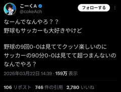 X民「野球の9回0-0は見てて楽しいのに、サッカーの90分0-0は超つまんないのなんでやろ?」→大バズリ