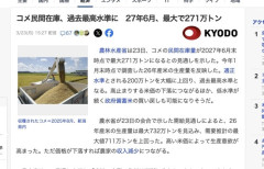 1 : コメ民間在庫、過去最高水準に 27年6月、最大で271万トン(共同通信) - Yahoo!ニュース 農林水産省は23日、コメの民間在庫量が2027年6月末時点で最大271万トンになるとの見通しを示した。今年1月末時点で調査した26年産米の生産量を反映した。適正水準とされる200万トンを大幅に上回り、過去最高水準となる。高止まりする米価の下落につながるほか、低水準が続く政府備蓄米の買い戻しも可能になりそうだ。 農水省が23日の会合で示した需給見通しによると、26年産米の生産量は最大732万トンを見込み、需要推計の最大値711万トンを上回った。高い米価によって生産意欲が高まった。ただ価格が下落すれば農家の収入減少につながる。全文はソースで…