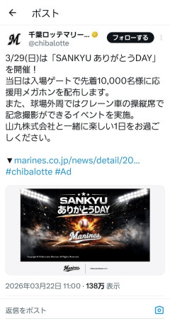 1: 名無しのスコールさん 2026/03/25(水) 18:55:37.39 ID:DngRW49y0 先着10000名に紙製メガホン配るよー ↓ ロッテファン「ハァ?手拍子応援はロッテファンのアイデンティティなんだよ!昔ながらのメガホン応援を排除するのにどれだけ努力したと思ってんだ!」 ↓ 配布中止に 引用元: ・…