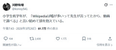 1: 2026/03/26(木) 23:14:08.05 小学生がWikipedia避けYouTube頼み、教授が頭を抱える投稿が話題 3月26日朝に✕へ投稿された河野教授の言葉は、数時間で9,600いいね超、35万ビューを記録。 学校でWikipediaの信頼性を疑うよう教わった子供たちが、代わりにYouTube を選ぶ姿に親や教師が苦笑いです。 一方、Wikipediaは2005年のNature調査でブリタニカ百科事典並みの正確性を示し、引用元を確認すれば信頼できると擁護の声も。 動画の誤情報リスクを指摘しつつ、子供たちに情報リテラシーを教える重要性が議論されています。 小学生低学年が、「Wikipediaは嘘が多いって先生が言ってたから、動画で調べる」と言い始めて頭を抱えている。— 河野有理 (@konoy541) March 26, 2026 ※関連記事 Wikipediaの「珍しい死の一覧」とかいうページwwww…