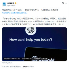 1: 2026/03/27(金) 07:00:38.29 対話型AIは「おべっか」 研究で明らかに 人間関係にも悪影響「チャットGPT」などの対話型のAIは「おべっか傾向」が高く、社会規範や対人関係に深刻な影響を与えることが明らかになりました。相談相手が人であれば必ず否定する内容でも、AIは半数超が利用者を肯定しました— 毎日新聞 (@mainichi) March 26, 2026 ※関連記事 【衝撃】チャットGPTに『これ』コピペしてみろ……