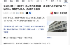 1 : 2021年12月、長崎市で商店からたばこを盗んで逃走したとして24日、ベトナム国籍の男が逮捕されました。 逮捕されたのは、住所不定・無職のベトナム国籍の男(27)です。 警察の調べによりますと、男は2021年12月15日午後3時15分頃、長崎市内の商店からたばこ2個(販売価格合計1200円)を盗んで逃走した疑いが持たれています。 その後、茨城県で在留期間が過ぎているにもかかわらず日本に滞在している男がいるとの情報が入り捜査を進めていたところ、長崎市のたばこ窃盗事件との関与が浮上。 警察では捜査の結果、男の犯行が明らかになったとして、4年以上が経過した今月24日、窃盗の容疑で逮捕しました。 全文はソースで…