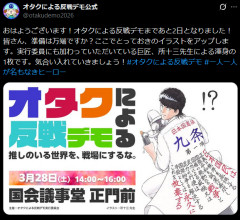 1: ウルトラ出光人(新日本) [CA] 2026/03/27(金) 10:21:36.39 ID:qp1rj+p30● BE:609257736-2BP(7777) オタクによる反戦デモ公式 @otakudemo2026 おはようございます!オタクによる反戦デモまであと2日となりました!皆さん、準備は万端ですか?ここでとっておきのイラストをアップします。実行委員にも加わっていただいている巨匠、所十三先生による渾身の1枚です。気合い入れていきましょう! …