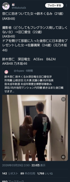 2: (邪馬台国) [ニダ]:2026/03/29(日) 10:16:12.94 BE:977790669-2BP(1000) >>1 ジャニーズ鈴木悠仁(21歳)に抱きついてる女=AKB48鈴木くるみ(21歳) 撮影者=AKB48田口愛佳(22歳) ドアを開けて部屋に入った後に日本酒をプレゼントした女=乃木坂46佐藤璃果(24歳) 動画 鈴木悠仁 鈴木くるみ深田竜生田口愛佳浮所飛貴 山根涼羽 元木湧 武藤小麟 向井地美音未成年飲酒 未成年喫煙全裸野球拳飲み深田/向井地同マンション内同棲 続きはまた後日載せます#嵐のバック #ACEES #banZAI #ジャニーズ#akb48 pic.twitter.com/ag8MpUoJyd— ︎︎ (@4qaes) March 28, 2026 画像 6:かかと落とし(兵庫県) [US]:2026/03/29(日) 10:20:10.81 ダルそう…
