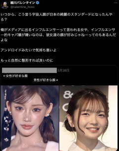 1. 匿名@ガールズちゃんねる 細川バレンタイン氏が「いつから、こう言う宇宙人顔が日本の綺麗のスタンダードになったんやろ? 俺がメディアに出るインフルエンサーって言われる女や、インフルエンサー的キャバ嬢が嫌いなのは、彼女達の顔が好みじゃねーってのもあるんだよな」などと私見を投稿した。 明日花は、この細川氏のポストを添付。 関連トピ 2026/03/29(日) 09:27:48…