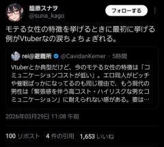 1: 2026/03/29(日) 14:34:22.60 モテる女性の特徴を挙げるときに最初に挙げる例がVtuberなの涙ちょちょぎれる。 — 籠原スナヲ (@suna_kago) March 29, 2026 ※関連記事 【画像】Vtuber星街すいせいファン、ガチで発狂wwwwwwwwww…