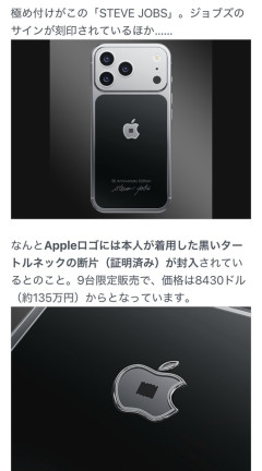 【画像】Apple50周年記念iPhone、9台限定135万円でジョブズのタートルネックの断片入り!!!