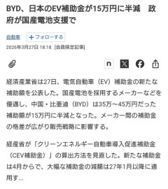 BYD、日本のEV補助金が15万円に半減。ていうか0にしろよ