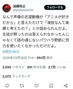 1: 2026/03/29(日) 13:31:13.253 どうして… ...なんで現役20年以上の声優さんにVTuberが上から演技の世界語ってるんだろう pic.twitter.com/0ToEg75bN4— Wi (@wi_the_way) March 28, 2026 ※関連記事 【画像】人気Vtuberさん、配信中にとんでもないサイトを閲覧する放送事故wwwwwwwww…