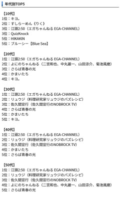 【悲報】好きなYouTuberランキング、10代だけが色々とおかしいwwww