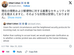 1: 少考さん ★ 2026/03/29(日) 21:18:59.09 ID:ID:ynG4vzkB9Gilad Cohen 🇮🇱@GiladCohen_ 現在の情勢および郵便物に対する厳重なセキュリティ対応を踏まえますと、そのような封筒は受領しておりません。 イスラエルを非難することを急ぐのではなく、民間人の居住地域を意図的にミサイル攻撃しているイラン政府に対しても、同様の抗議がイラン大使館宛に行われているか、ご確認いただければ幸いです。 加えて、民間人への攻撃および核能力の追求を続けている国であるイランの駐日大使に対し、懸念を直接伝えられることを推奨いたします。これに対し、イスラエルおよび米国は正当とされる軍事目標に対してのみ行動しています。 【速報】辺野古転覆事故、ついに「死者の政治私物化」が始まる。米軍基地内での献花にブチギレる活動家... 【ニュース】 サウジアラビアの米軍基地、ドローン飽和攻撃からのミサイル攻撃で壊滅・・・ 『地頭』とかいう概念wwwww…